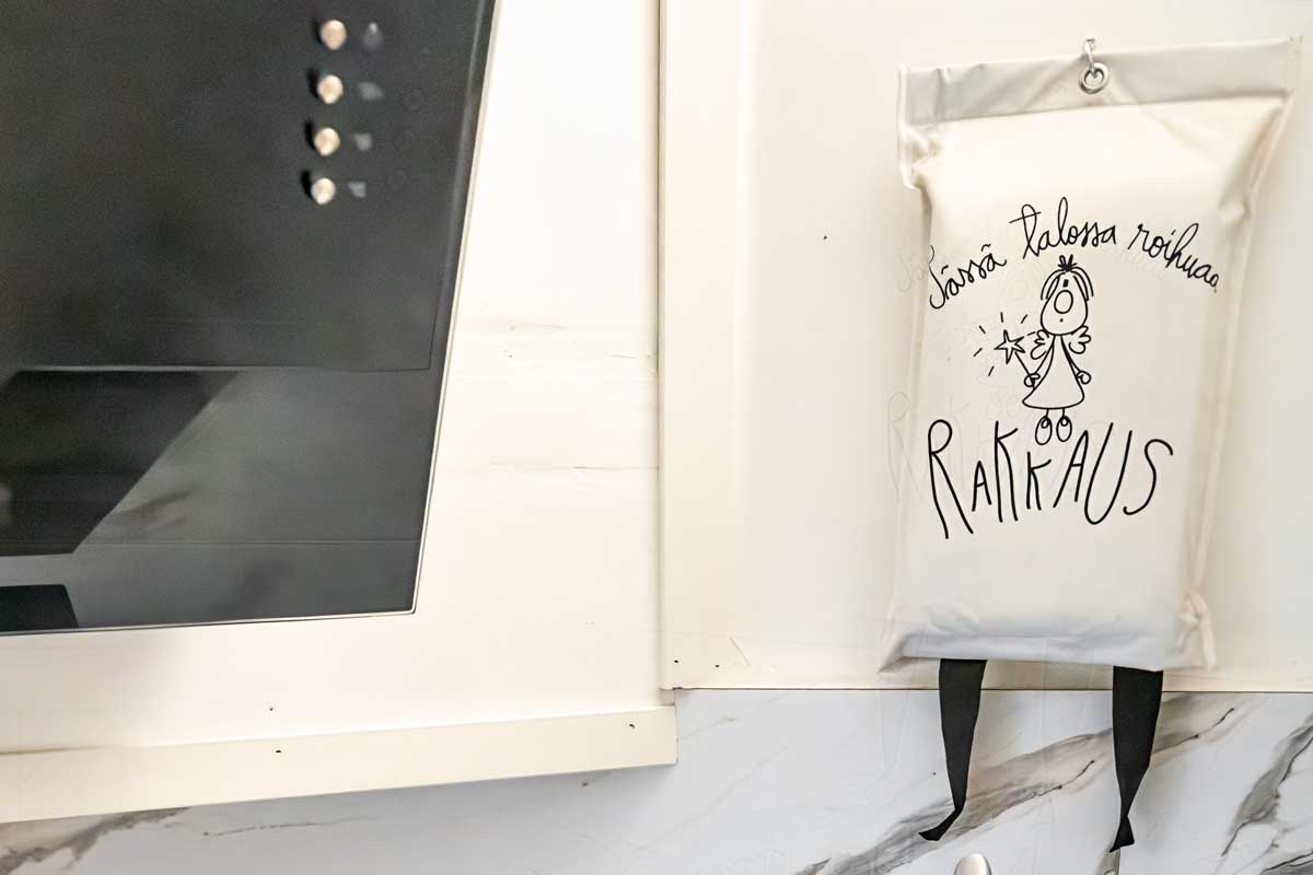 Kiinnitä näkyvälle paikalle keittiön seinälle tukevasti sammutuspeite, josta se on helposti irrotettavissa tarpeen tullen. Harjoittele sen käyttöä mielikuvien avulla. Irrota peite tarvittaessa ja aseta tukevasti määrätietoisella otteella itsestäsi poispäin palavan esineen päälle siten, että hapensaanti loppuu.