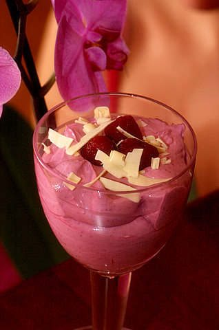 Koristele muutamalla vadelmalla ja valkosuklaalastuilla.