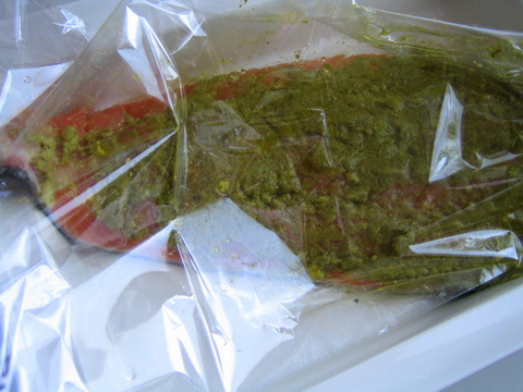 Hiero lohifileen pintaan murskatut valkosipulinkynnet, sekä pestokastike.Pesto-lojo