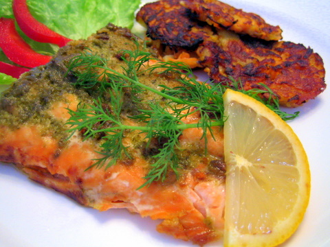 Tarjoa röstiperunat pesto-lohen kanssa.